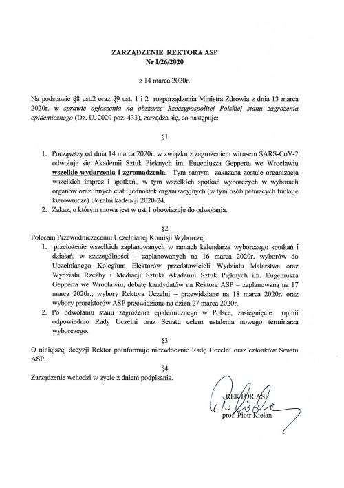 The above information is based on the Order No. I/26/2020 of the Rector of the E. Geppert Academy of Fine Arts in Wrocław of 14 March 2020, which is included in the attachment.