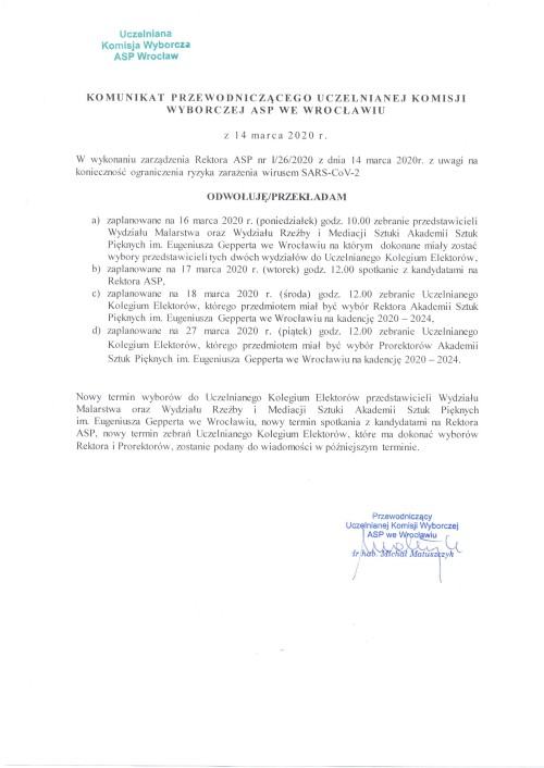 By virtue of the Ordinance of the Rector of the Academy of Fine Arts I/26/2020 of 14 March 2020 and in accordance with the Announcement of the Chairperson of the Academy of Fine Arts Election Commission, all meetings and meetings scheduled for the election of the Rector of the Academy of Fine Arts for the term 2020-2024 are cancelled / postponed.