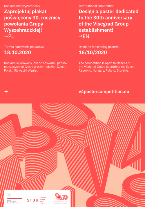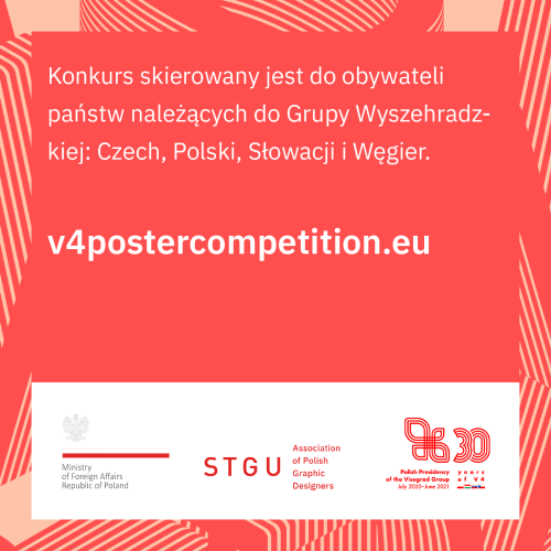 Więcej o konkursie na stronie:https://v4postercompetition.eu lub na stronie Stowarzyszenia Twórców Grafiki Użytkowej: https://www.stgu.pl/dzieje-sie/konkursy/event-miedzynarodowy-konkurs-na-plakat-30-rocznica-powstania-grupy-wyszehradzkiej.html