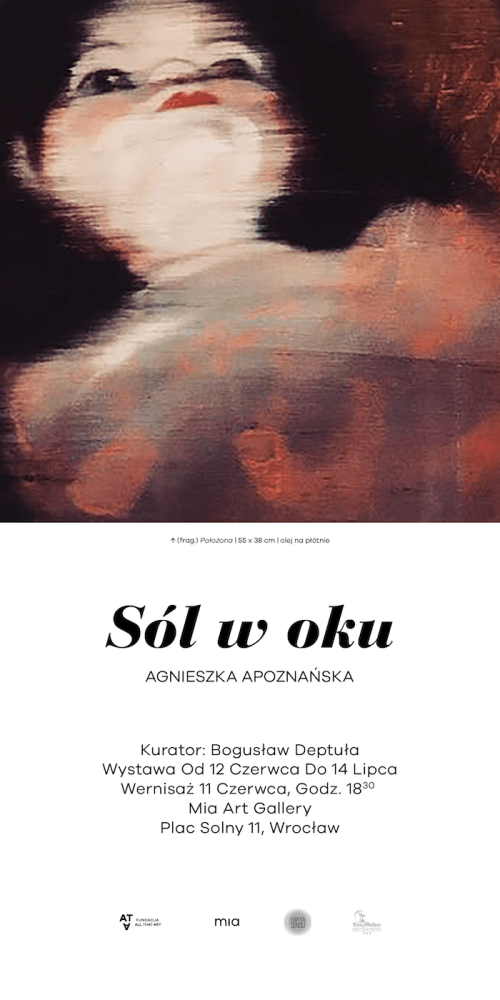 Zapraszamy do mia ART GALLERY znajdującej się na Placu Solnym 11 na wernisaż wystawy Agnieszki Apoznańskiej Sól w oku. Wernisaż odbędzie się 12 czerwca o godzinie 18:30 przy zachowaniu niezbędnego reżimu sanitarnego. Wystawa potrwa do 14 lipca.