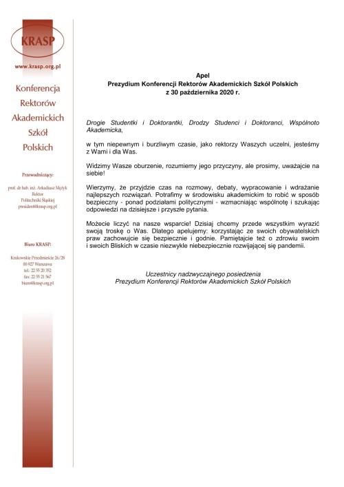 Apel Prezydium Konferencji Rektorów Akademickich Szkół Polskich z 30 października 2020 r