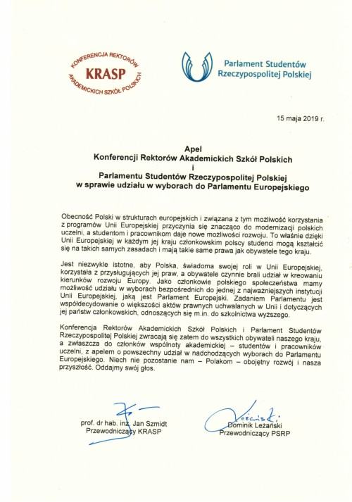 Konferencja Rektorów Akademickich Szkół Polski i Parlament Studentów Rzeczypospolitej Polskiej zwracają się zatem do wszystkich obywateli naszego kraju, a zwłaszcza do członków wspólnoty akademickiej – studentów i pracowników uczelni, z apelem o powszechny udział w nadchodzących wyborach do Parlamentu Europejskiego. Niech nie pozostanie nam – Polakom – obojętny rozwój i nasza przyszłość. Oddajmy swój głos.