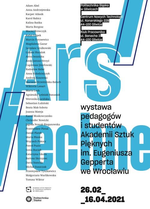 Politechnika Śląska po raz kolejny gości twórców związanych z wrocławską ASP prezentując wystawę pedagogów i studentów. Tym razem ekspozycja obejmuje udział wszystkich wydziałów Akademii, artyści i projektanci przedstawiają swoje ostatnie osiągnięcia w przestrzeniach Centrum Nowych Technologii oraz Klubu Pracownika. Prace malarskie i graficzne, rzeźby, projekty i prototypy, obiekty ze szkła i ceramiki można oglądać w formie wystawy zatytułowanej Ars/Techne, która ukazać ma różnorodność twórczych działań, postaw artystycznych, sposobów realizacji celów projektowych oraz dążeń, których istotą jest, na drodze wizualnej formy, wzbudzenie emocji, doznań czy skłonienie do refleksji.