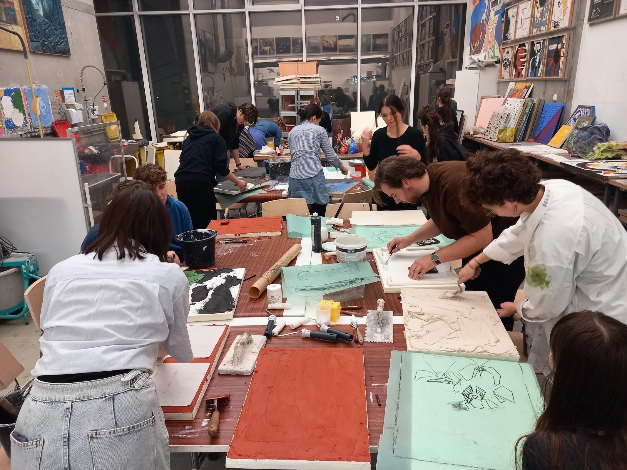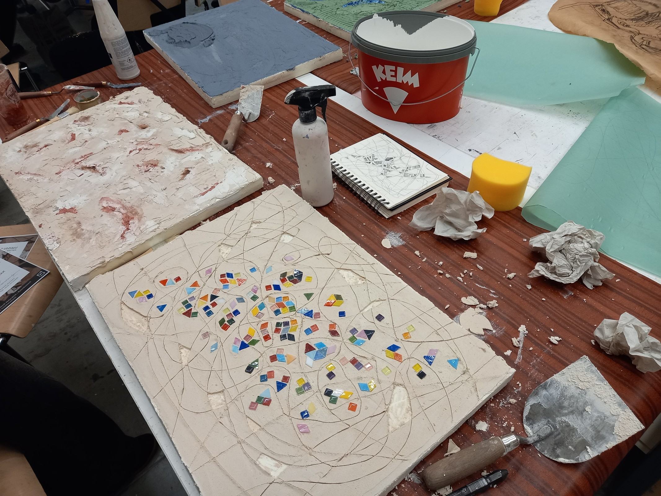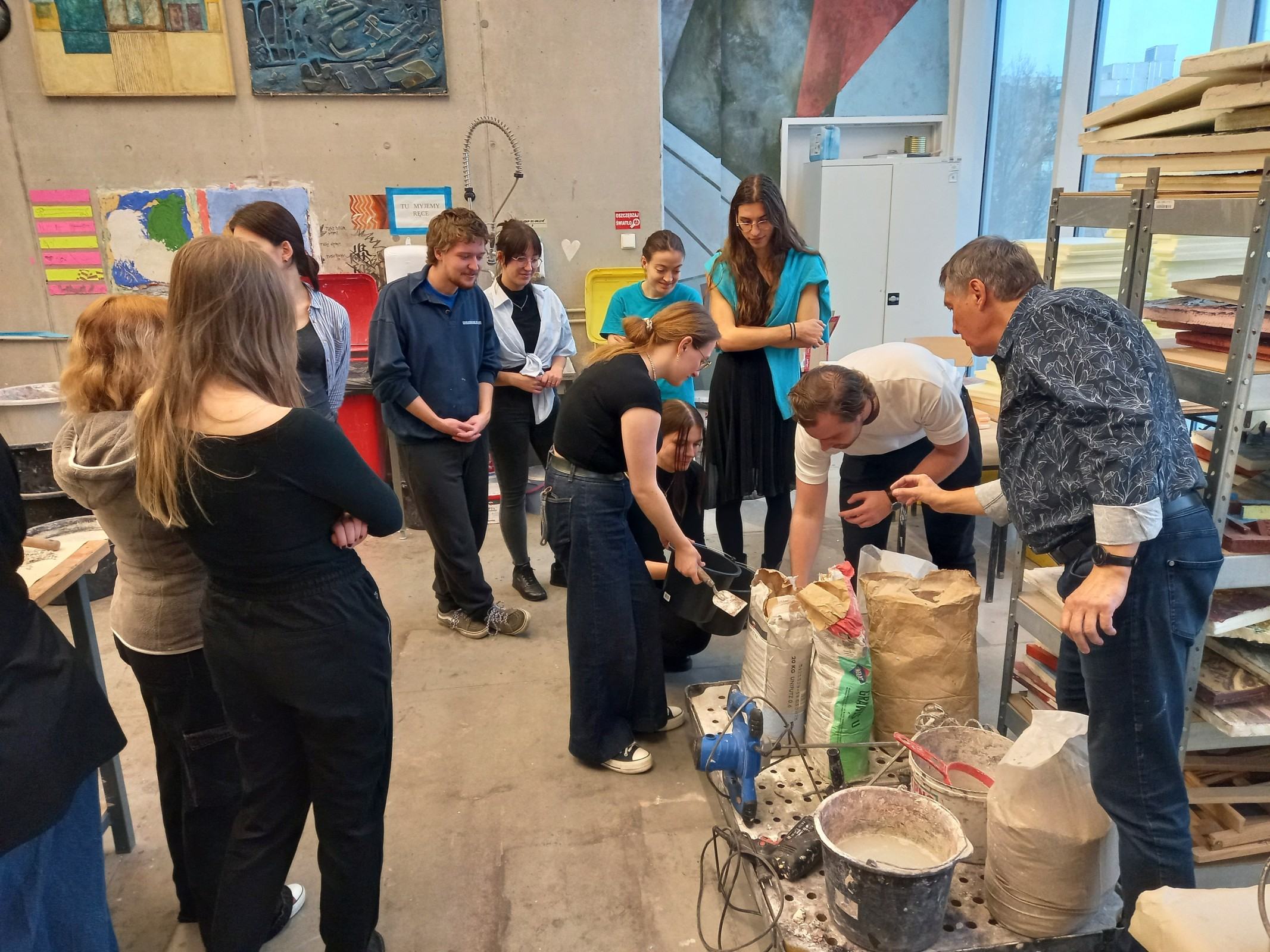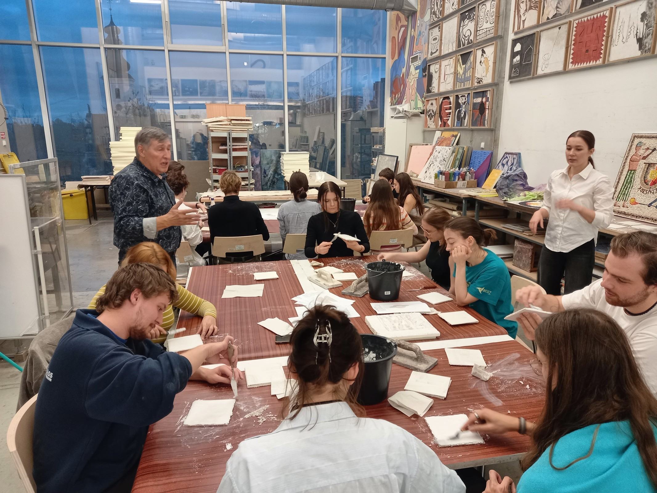Kolejnym etapem spotkania było wykonanie przez adeptów architektury, pod okiem prowadzących, cyklu ćwiczeń, w ramach których powstała seria prostych próbek z wykorzystaniem materiałów mineralnych oraz ich naturalnego brzmienia. Próbki zostały wykonane w technikach tj. sgraffito klasyczne, sgraffito współczesne, mozaika w różnych wariantach surowcowych, technika malarstwa mineralnego, technika malarstwa akrylowego. Próbki są elementem wspólnego projektu badawczego: interdyscyplinarnego Laboratorium LET's GO (funkcjonującego w strukturze Katedry Inżynierii Materiałów i Procesów Budowlanych, Wydziału Budownictwa Wodnego i Lądowego Politechniki Wrocławskiej) oraz Pracowni Technik Malarskich i Rysunkowych oraz Działań Innowacyjnych nr 406 T (funkcjonującej w strukturze Katedry Malarstwa Architektonicznego i Multimediów ASP).