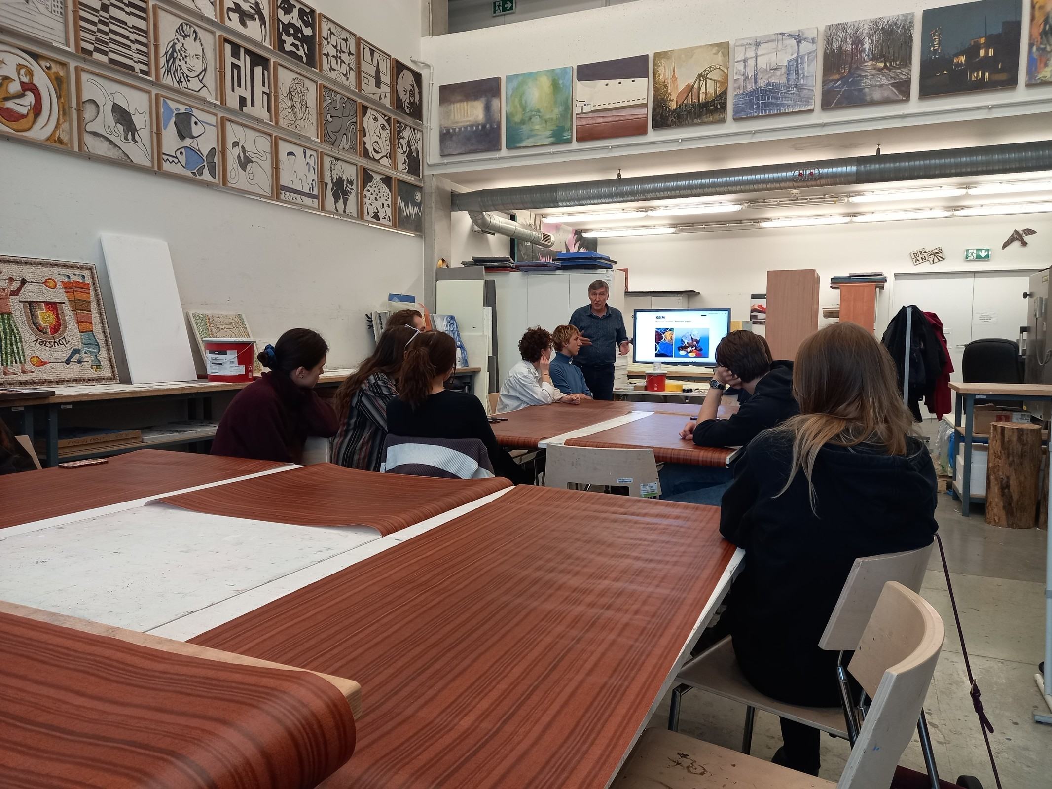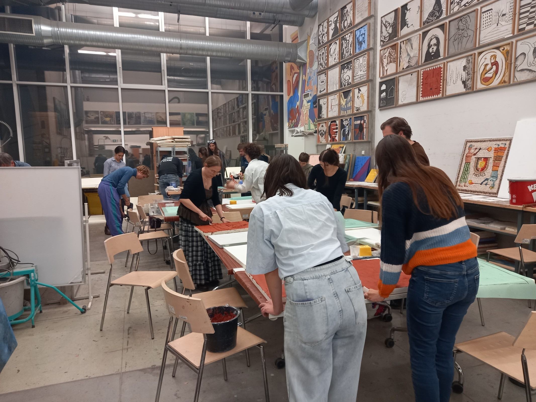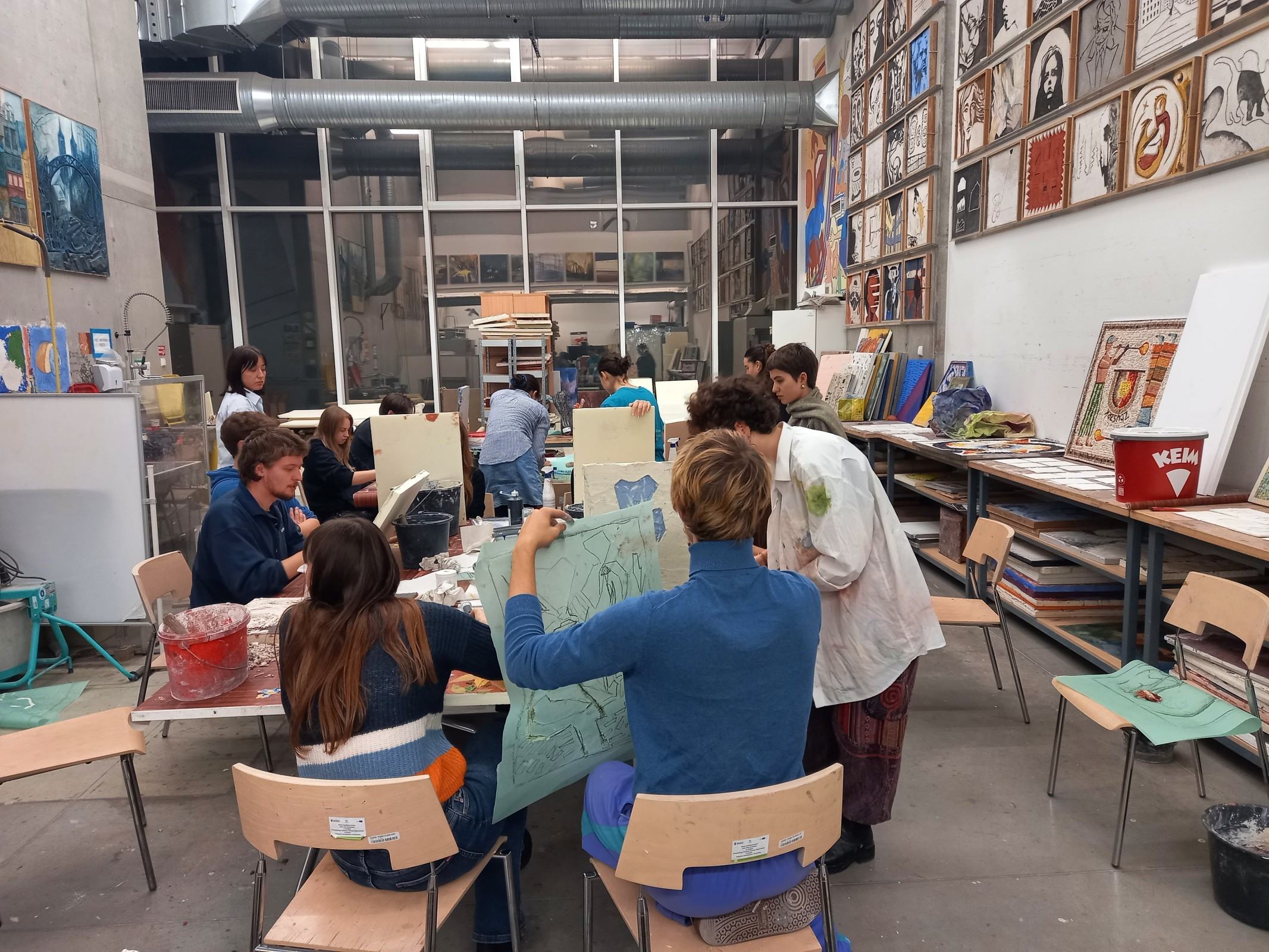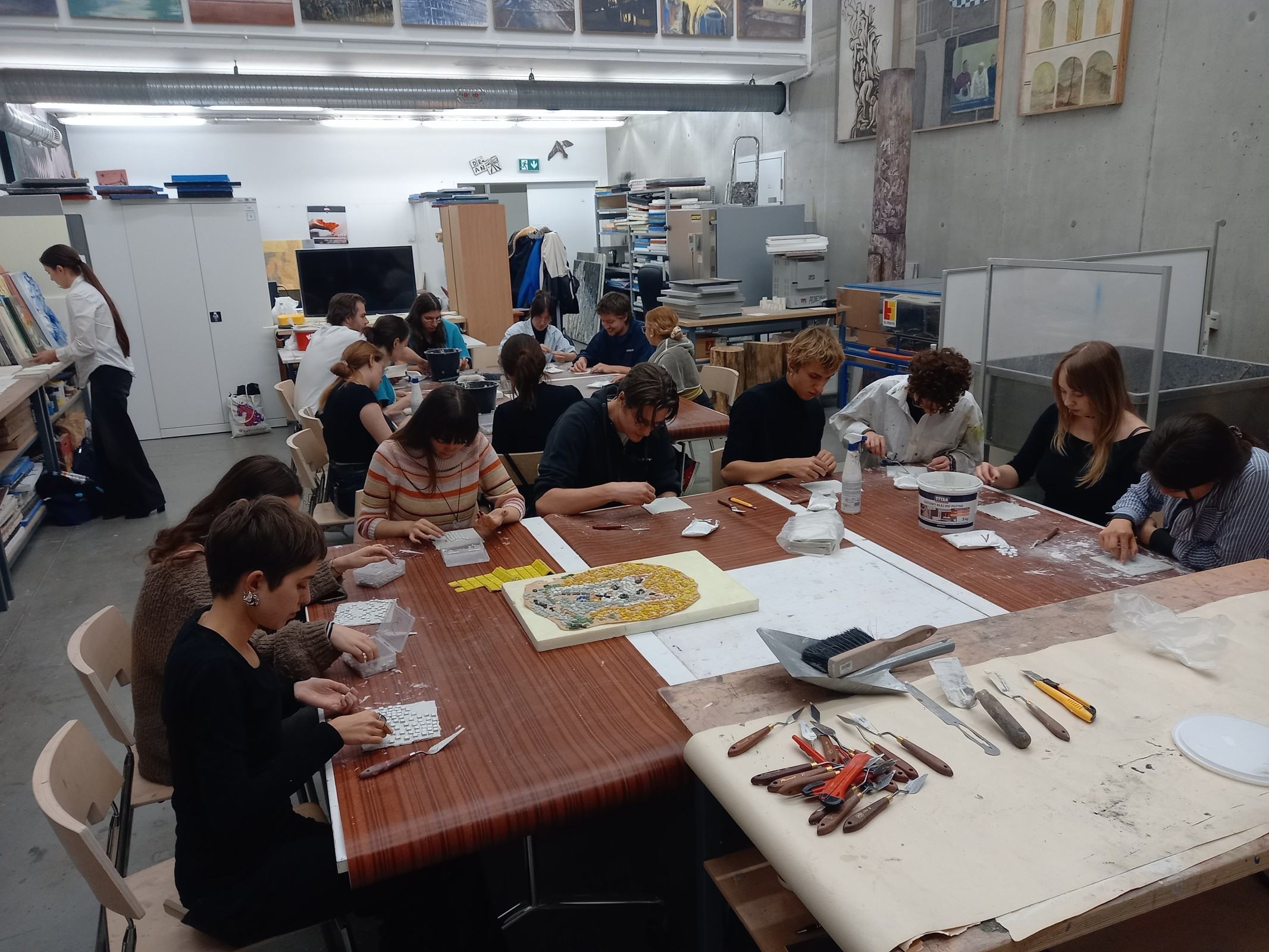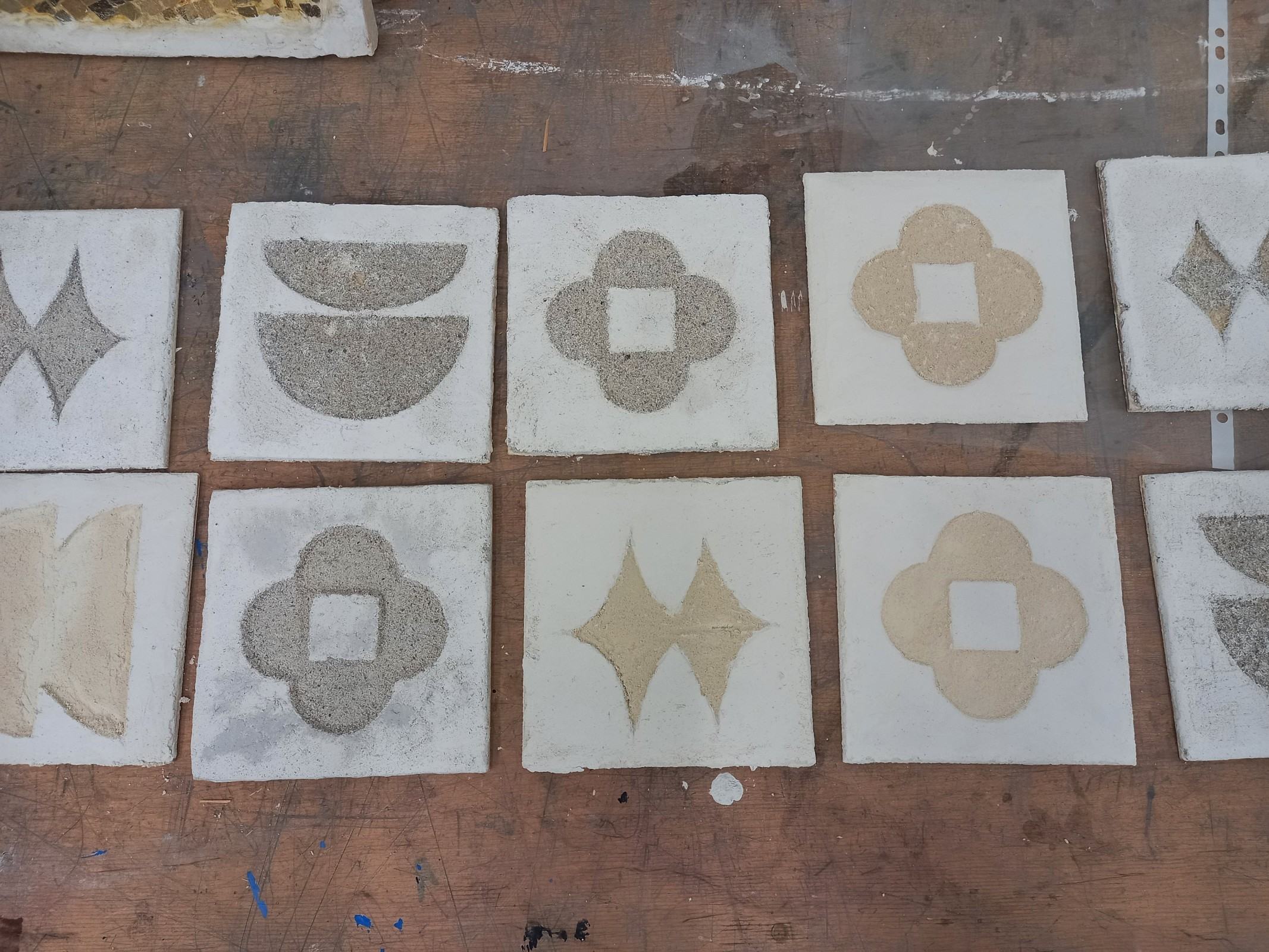 Kolejnym etapem spotkania było wykonanie przez adeptów architektury, pod okiem prowadzących, cyklu ćwiczeń, w ramach których powstała seria prostych próbek z wykorzystaniem materiałów mineralnych oraz ich naturalnego brzmienia. Próbki zostały wykonane w technikach tj. sgraffito klasyczne, sgraffito współczesne, mozaika w różnych wariantach surowcowych, technika malarstwa mineralnego, technika malarstwa akrylowego. Próbki są elementem wspólnego projektu badawczego: interdyscyplinarnego Laboratorium LET's GO (funkcjonującego w strukturze Katedry Inżynierii Materiałów i Procesów Budowlanych, Wydziału Budownictwa Wodnego i Lądowego Politechniki Wrocławskiej) oraz Pracowni Technik Malarskich i Rysunkowych oraz Działań Innowacyjnych nr 406 T (funkcjonującej w strukturze Katedry Malarstwa Architektonicznego i Multimediów ASP).