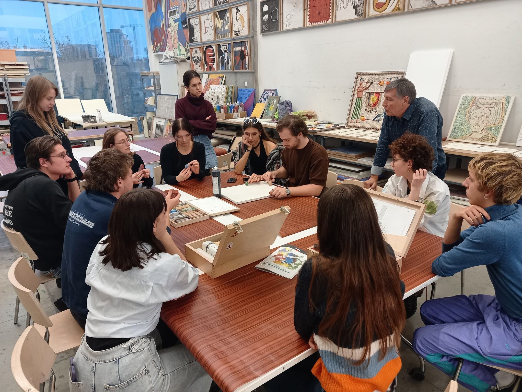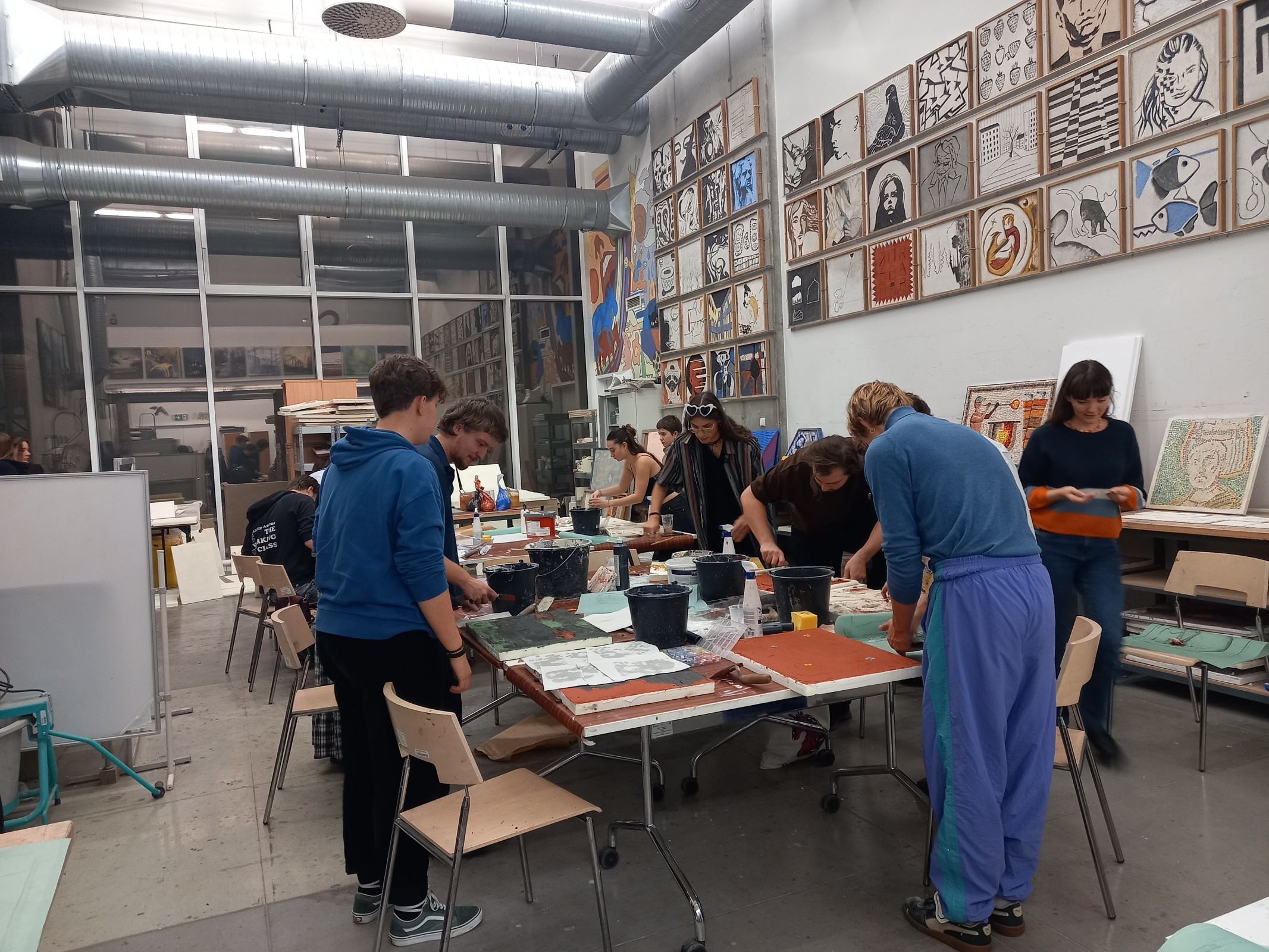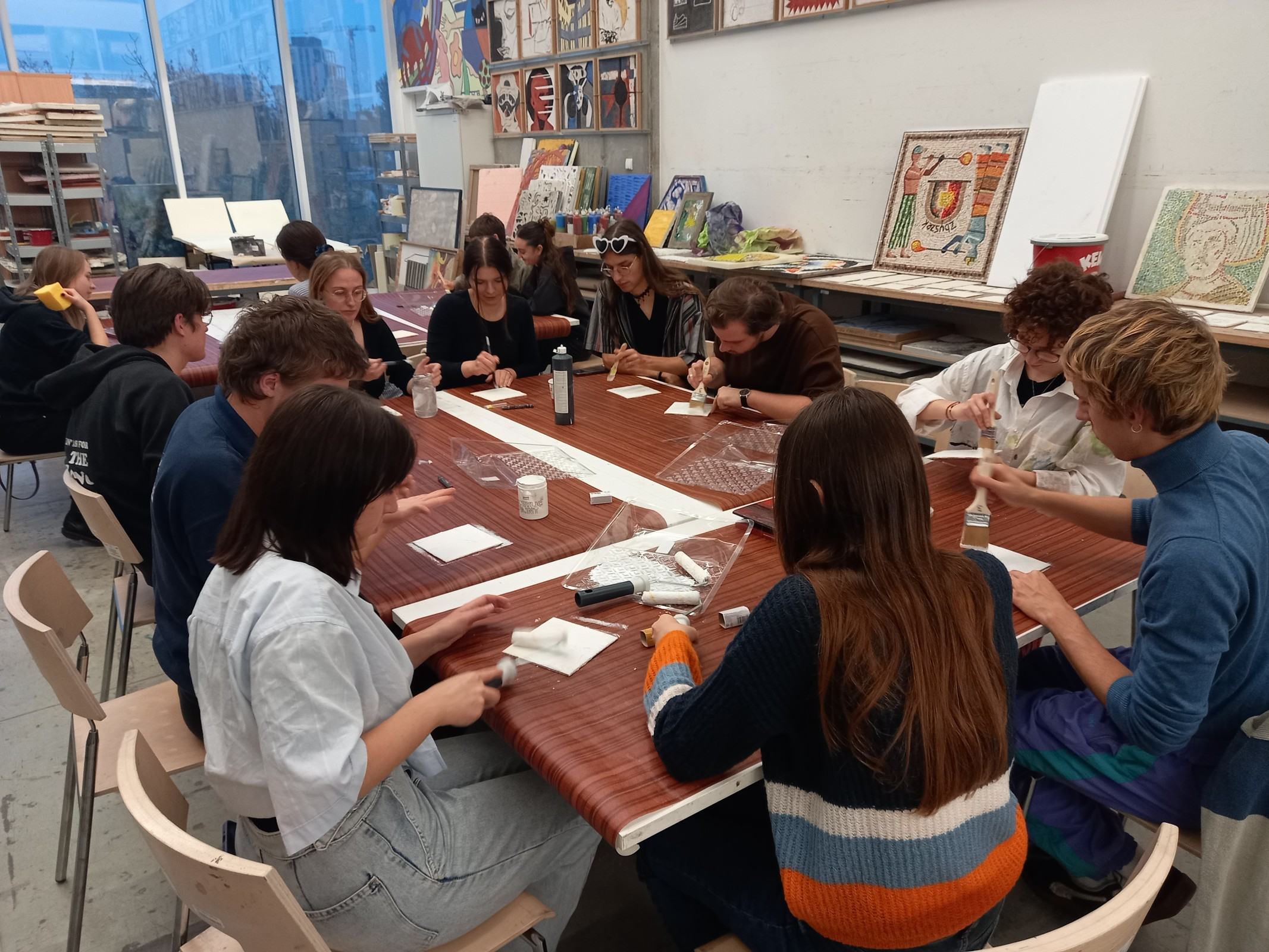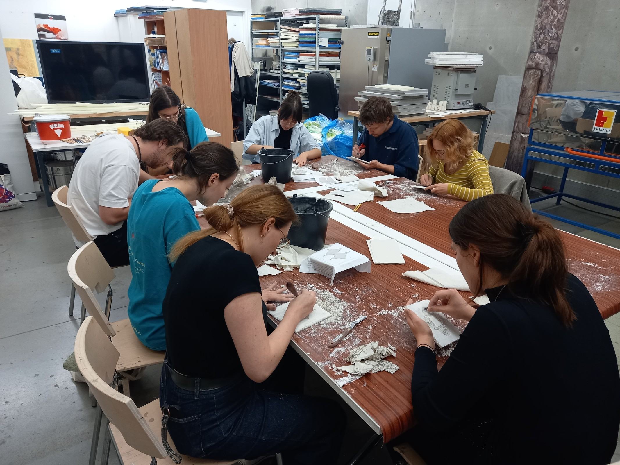 Kolejnym etapem spotkania było wykonanie przez adeptów architektury, pod okiem prowadzących, cyklu ćwiczeń, w ramach których powstała seria prostych próbek z wykorzystaniem materiałów mineralnych oraz ich naturalnego brzmienia. Próbki zostały wykonane w technikach tj. sgraffito klasyczne, sgraffito współczesne, mozaika w różnych wariantach surowcowych, technika malarstwa mineralnego, technika malarstwa akrylowego. Próbki są elementem wspólnego projektu badawczego: interdyscyplinarnego Laboratorium LET's GO (funkcjonującego w strukturze Katedry Inżynierii Materiałów i Procesów Budowlanych, Wydziału Budownictwa Wodnego i Lądowego Politechniki Wrocławskiej) oraz Pracowni Technik Malarskich i Rysunkowych oraz Działań Innowacyjnych nr 406 T (funkcjonującej w strukturze Katedry Malarstwa Architektonicznego i Multimediów ASP).