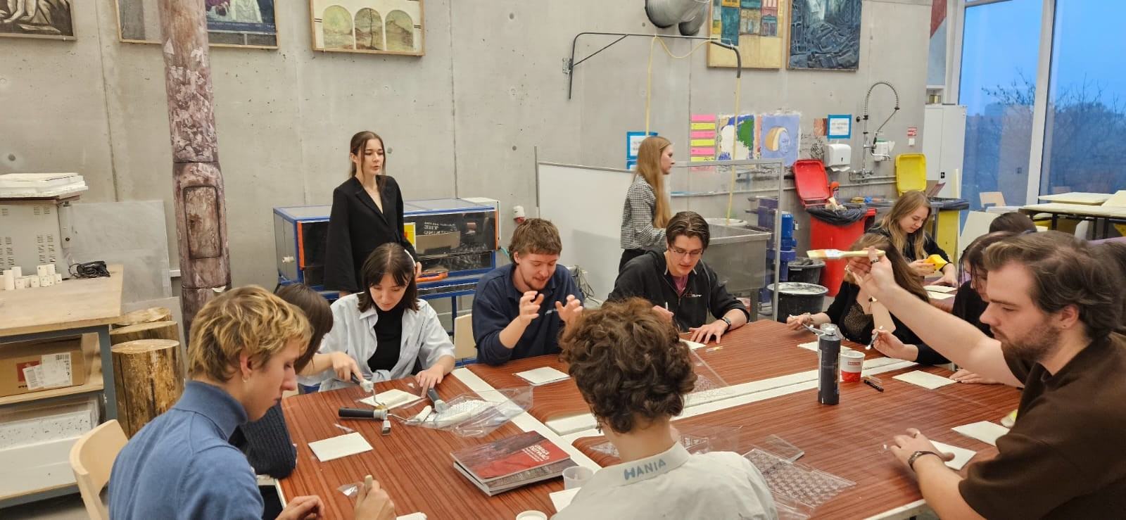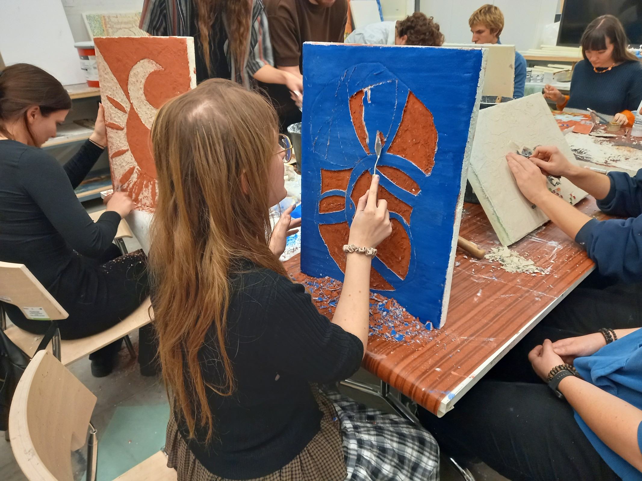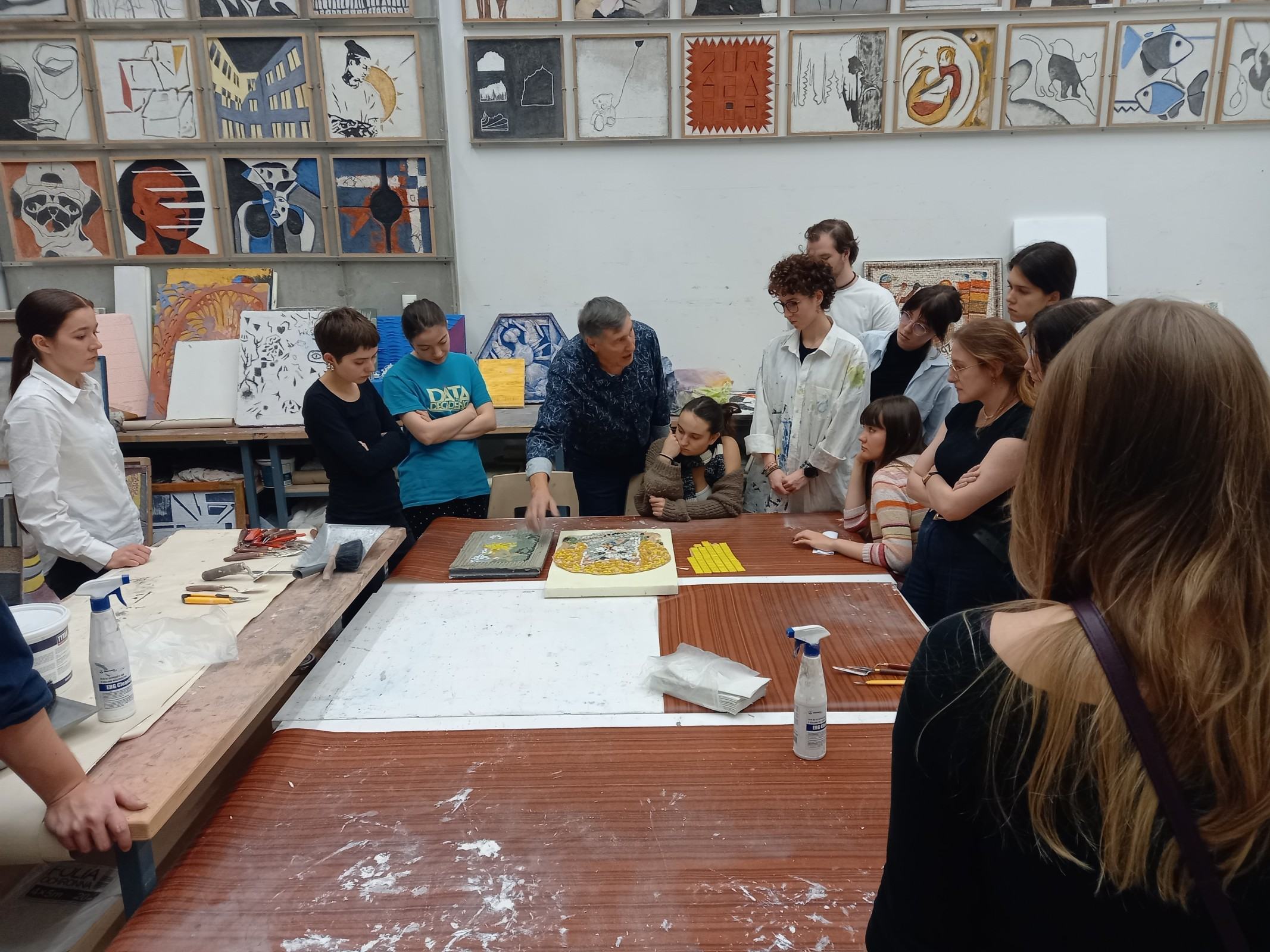 Ostatnim etapem warsztatów było zrealizowanie przez każdego z uczestników pracy własnej na podłożu specjalnie przygotowanym przez prowadzących. Studenci mieli okazję wykazać się pozyskaną wiedzą i umiejętnościami, zdobytymi podczas wykładów oraz ćwiczeń. Zadaniem było wykonanie swobodnej pracy artystycznej o charakterze haptycznym w technice mieszanej i z wykorzystaniem materiałów mineralnych. Efekty tego zadania już wkrótce zostaną zaprezentowane podczas wystawy zbiorowej.