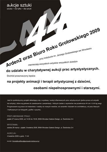 Arden2 oraz Biuro Roku Grotowskiego 2009 przy Instytucie im. Jerzego Grotowskiego we Wrocławiu zapraszają artystów wszystkich dziedzin do udziału w charytatywnej aukcji prac artystystycznych. Jest to symbiotyczny projekt składający się z wystawy i aukcji ofiarowanych prac (jedna praca od artystki lub artysty ),które są gotowe do zawieszenia i prezentacji, i których żaden z wymiarów nie przekracza 44 cm i 4,44 kg wagi. Przyjmowane są prace od malarstwa, rzeźby do nowych mediów, od ceramiki, biżuterii do architektury, od prac tkanych i haftowanych do fotografii, grafiki i rysunku ). PRZYJMOWANIE PRAC: piątek 27 marca, 2009, od 14:00 do 19:00, BWA Wrocław Galeria Design, ul. Świdnicka 2-4 WYSTAWA: sobota 28 marca - piątek 3 kwietnia, 2009, BWA Wrocław Galeria Design, ul. Świdnicka 2-4 AUKCJA: 4 kwietnia 2009 o godz. 11:44 kontakt: SztukaBiuraRoku@grotowski-institute.art.pl Informacja : Arden2 oraz Biuro Roku Grotowskiego 2009