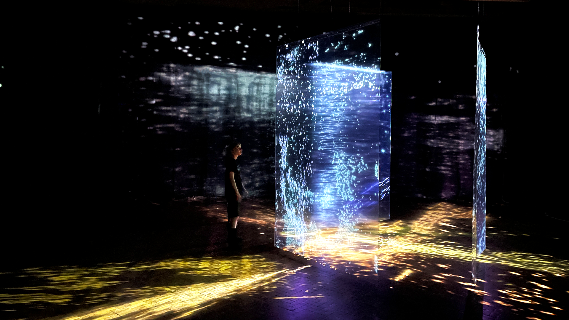 „Przestrzeń – Jednostka" to interaktywna instalacja, która pozwala odbiorcy doświadczać obecności. Świetlne punkty to ślad działań jednostki. Będące w ciągłym ruchu ukazują proces przekształcania przestrzeni poprzez ludzką aktywność. Instalacja opiera się na czułym systemie reagującym na obecność widza. W tym doświadczeniu ujawniają się dwa wymiary Przestrzeni: fizyczny i symboliczny. Zawieszone ekrany nadają jej architektoniczny porządek, organizując otoczenie, a ciało widza staje się integralnym elementem kompozycji. Projekcja – niematerialna i zmienna – to znaczenia, emocje i informacje krążące pomiędzy bytami. Reaktywny system działa jak sieciowe algorytmy: odpowiada na zachowania użytkownika, tworząc spersonalizowane układy, interpretacje i nowe sposoby odczytywania przestrzeni.