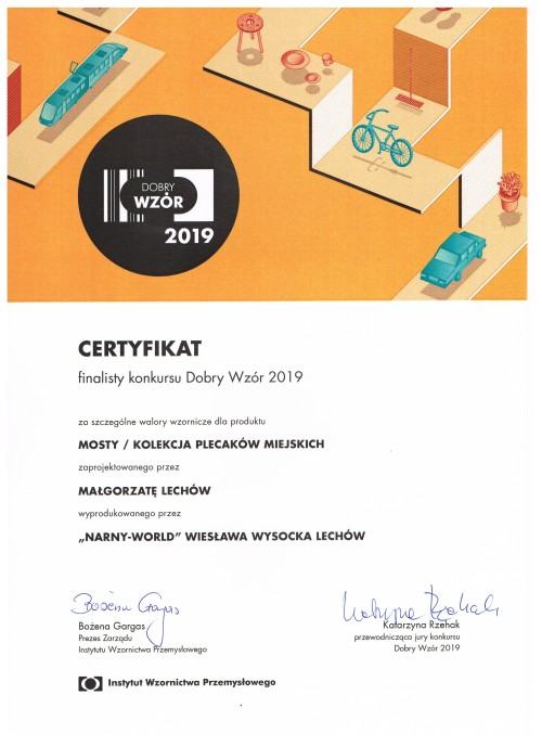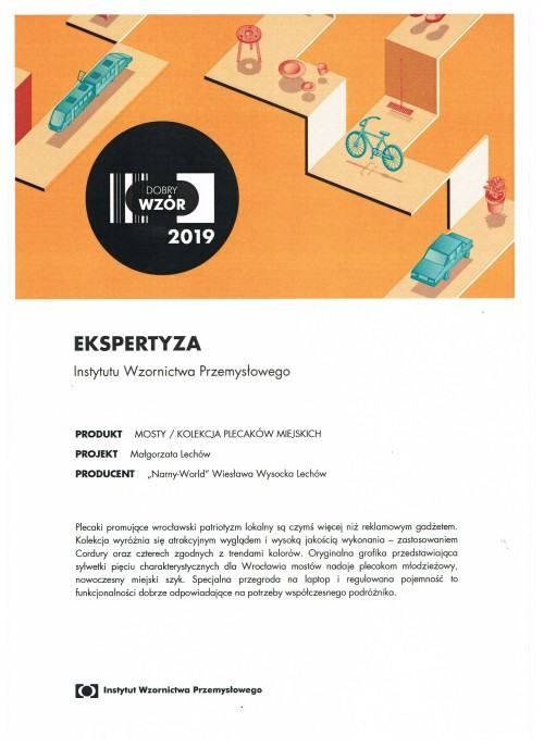 Nagrodę uzyskała za projekt "MOSTY / kolekcja plecaków miejskich". Projekt został doceniony za atrakcyjny wygląd i wysoką jakość wykonania – zastosowaniem Cordury oraz czterech zgodnych z trendami kolorów. Oryginalna grafika przedstawiająca sylwetki pięciu charakterystycznych dla Wrocławia mostów nadaje plecakom młodzieżowy, nowoczesny miejski szyk."