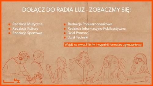 Wraz z nowym rokiem akademickim, Radio LUZ rozpoczyna rekrutację do swoich redakcji i działów. Dzisiaj (5 października) otwieramy nasz formularz zgłoszeniowy. Zbieranie odpowiedzi potrwa do 18 października - wtedy zaprosimy chętnych na rozmowy kwalifikacyjne.