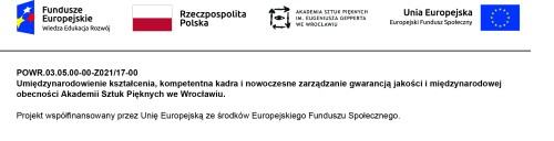 Zajęcia w Pracowni Profesora Wizytującego organizowane są w ramach projektu: „Umiędzynarodowienie kształcenia, kompetentna kadra i nowoczesne zarządzanie gwarancją jakości i międzynarodowej obecności Akademii Sztuk Pięknych we Wrocławiu" współfinansowanego przez Unię Europejską ze środków Europejskiego Funduszu Społecznego.