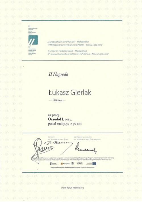 ,,Europejski Festiwal Pasteli - Małopolska VI Międzynarodowe Biennale Pasteli - Nowy Sącz 2013''. Ceremonia wręczenia nagród odbyła się 6.IX.2013r. w BWA Sokół w Nowym Sączu. Na tegoroczny konkurs wpłynęła rekordowa liczba 1123 prac ponad 400 artystów z 30 państw.