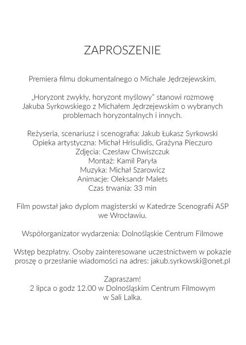 „Horyzont zwykły, horyzont myślowy” stanowi rozmowę Jakuba Syrkowskiego dyplomanta w Katedrze Scenografii z profesorem Michałem Jędrzejewskim o wybranych problemach horyzontalnych i innych.