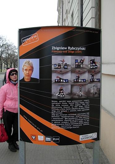 Gwiazdami festiwalu byli w tym roku Peter Greenaway oraz Zbigniew Rybczyński. O ile Greenaway przyjechał dopiero w niedzielę prosto na swój pokaz multimedialny, Rybczyński obecny był podczas całego festiwalu biorąc udział w kilku prezentacjach i panelach dyskusyjnych. Kończącego festiwal pokazu Petera Greenaway'a już nie widziałem. Krótki reportaż i komentarz do wydarzenia można obejrzeć na stronie TVP SZCZECIN. inSPIRACJE zaistniały początkowo jako festiwal fotografii, by dwa lat temu przeistoczyć się w festiwal sztuk wizualnych. Fotografia ma jednak na festiwalu swoje stałe niezagrożone miejsce. W tym obszarze najbardziej znanym polskim twórcą był Stefan Wojnecki. Było też kilku fotografów zagranicznych. Ja udałem się na wernisaż Miro Slovika z Czech (fot. 16-18) Obok projektów indywidualnych prezentowano kilka wystaw zbiorowych, wśród których wymienię „Wszystkie kolory są dozwolone, pod warunkiem, że nie przeszkadzają w handlu” oraz „Enter/Escape – jak malarstwo kształtuje nowe przestrzenie?”. Pierwsza to międzynarodowy projekt artystów (m.in. z Belgii, Szwecji, Francji, Niemiec, Australii), którzy poprzez odpowiedni dobór i zestawienie przedmiotów codziennego użytku wprowadzają je w obszar sztuki (fot. 4-10). Druga wystawa to zwycięski projekt kuratorski autorstwa Karoliny Jabłońskiej i Anki Leśniak (fot. 11-15) prezentujący prace zarówno debiutantów jak i weteranów polskiego malarstwa. Jednym z miejsc wystawienniczych tegorocznych inSPIRACJI była słynna willa Lentza – posiadłość najbogatszego przed wojną mieszkańca Szczecina. Prezentowano tam projekty otwarte (fot. 19-22); tam też została wręczona Nagroda Prezydenta Szczecina. Krótki materiał z willi Lentza można obejrzeć na stronie TVP SZCZECIN. Poza wystawami w galeriach kilka ciekawych obiektów zafunkcjonowało w przestrzeni miejskiej (fot. 23-25) Ponieważ znaczną część czasu musiałem poświęcić na instalację własnego projektu, udało mi się udokumentować niespełna jedną trzecią festiwalowych imprez. Obszerna relacja fotograficzna wkrótce powinna pojawić się na stronie inSPIRACJI. Festiwal inSPIRACJE 09 został zorganizowany i przeprowadzony na bardzo wysokim poziomie. Wyraźnie dało się odczuć, że szczecińska publiczność łaknie nowej sztuki, o czym świadczyły tłumy widzów zebrane we wszystkich festiwalowych galeriach rozsianych po centrum miasta. Dlatego gorąco zachęcam by zgłaszać się na kolejne edycje inSPIRACJI. Już teraz na stronie festiwalu został ogłoszony otwarty konkurs na logo przyszłorocznej edycji, której temat przewodni brzmi: „glamour”. Jakub Jernajczyk Katedra Sztuki Mediów