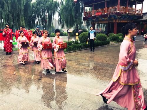 Kolejny dzień i (…) wizyta w odrestaurowanym miasteczku, o malowniczych, krętych uliczkach oferujących specjały kuchni shanxi. Wyśmienity chiński makaron, który w popisowy sposób wirował we wprawnych rękach kucharza stanowił główną część porcji „michy" z wołowiną, za którą stała kawalkada niecierpliwie wyczekujących w strugach deszczu smakoszy. Odstałem swoje, ale było warto, a rozgrzewająca strawa zachęciła do udziału w nocnym przedstawieniu na wolnym powietrzu. Nocny występ kilkuset aktorów w strugach deszczu, pośród kaskad sztucznych ogni i kompilacja kolorowych parasoli na ogromnej widowni powracają we mnie zadziwiająco realnym wspomnieniem baśniowej iluzji.