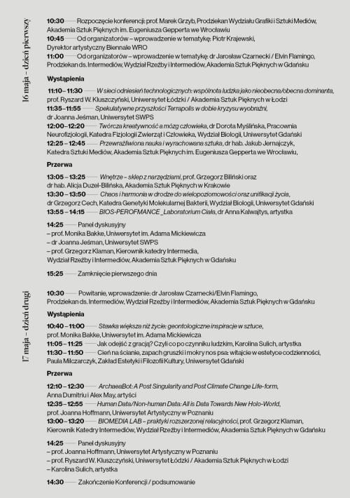 - 13:05-13:25 Wnętrze – sklep z narzędziami, prof. Grzegorz Biliński oraz dr hab. Alicja Duzel-Bilińska, Akademia Sztuk Pięknych w Krakowie 13:30-13:50 Chaos i harmonia w drodze do wielopoziomowości oraz unifikacji życia, dr Grzegorz Cech, Katedra Genetyki Molekularnej Bakterii, Wydział Biologii, Uniwersytet Gdański 13:55-14:15 BIOS-PEROFMANCE _Laboratorium Ciała, dr Anna Kalwajtys, artystka