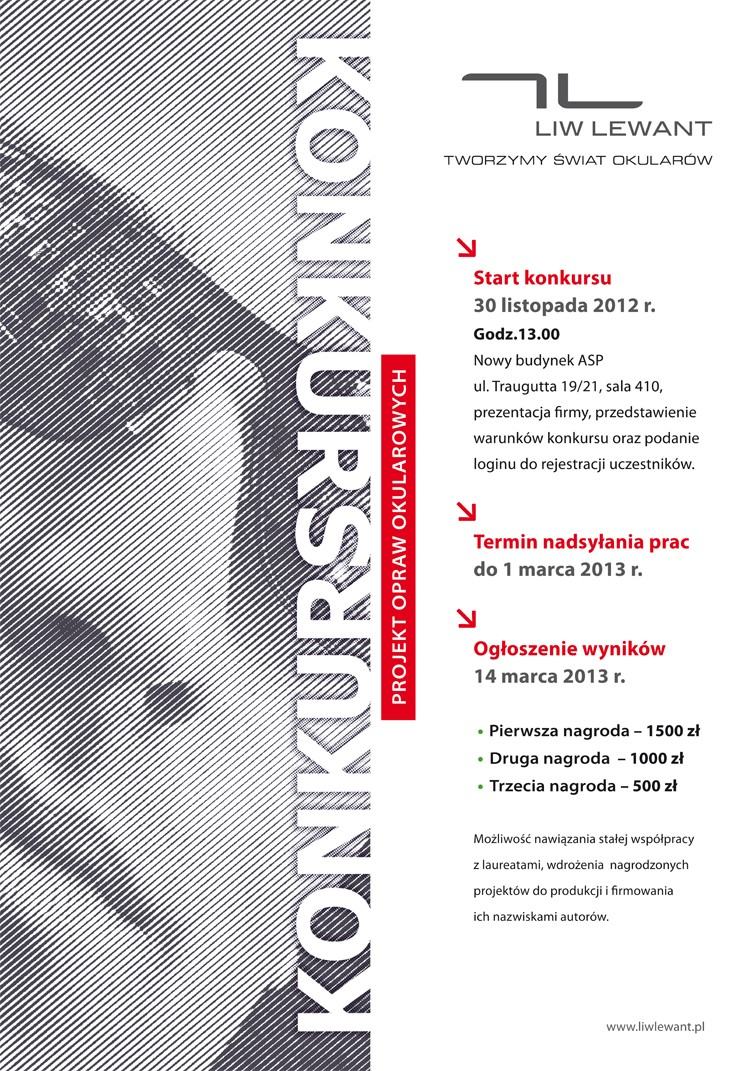 Liw Lewant - największy producent wysokiej klasy opraw okularowych w Polsce i jedyny na świecie producent metalowych opraw okularowych z hypoalergicznymi nanopowłokami tytanowymi - zaprasza studentów kierunków projektowych Akademii Sztuk Pięknych do udziału w konkursie na projekt nowej oprawy okularowej przy wykorzystaniu technologii produkcji opraw metalowych, plastikowych i metalowo plastikowych.Prezentacja firmy odbędzie się 30 listopada w sali 410 w nowym budynku ASP o godz.13.00