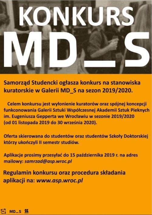 Samorząd Studencki ogłasza konkurs na stanowiska kuratorskie wystaw w Galerii MD_S na rok kulturalny 2019/2020.