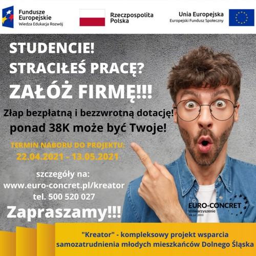 O przyznanie bezpłatnej i bezzwrotnej dotacji na start własnej firmy mogą ubiegać się osoby w wieku 18-29l., zamieszkujące lub/i uczące się na terenie woj. dolnośląskiego, które utraciły zatrudnienie po 1 marca 2020r. i pozostają osobami biernymi zawodowo lub bezrobotnymi niezarejestrowanymi w urzędzie pracy. Szczegóły na www.euro-concret.pl/kreator