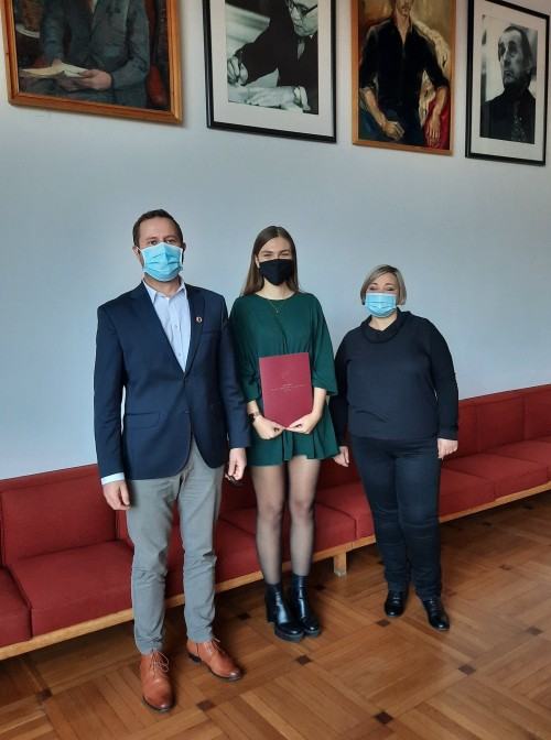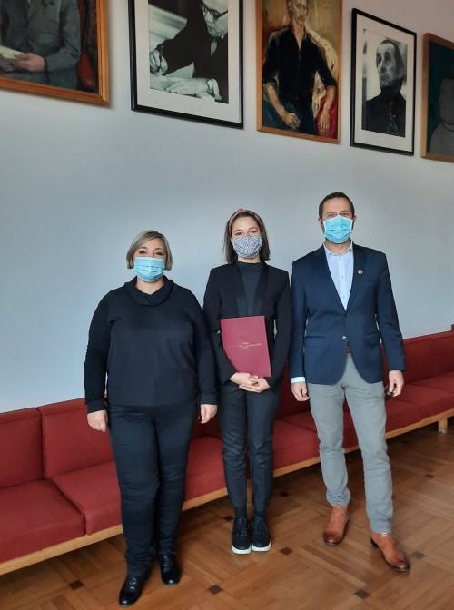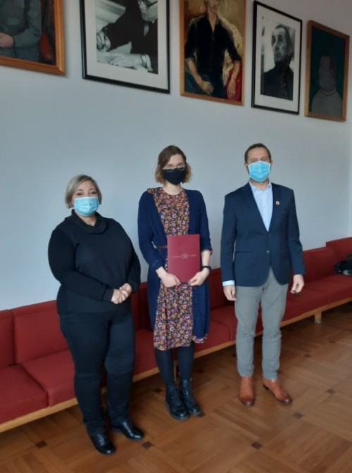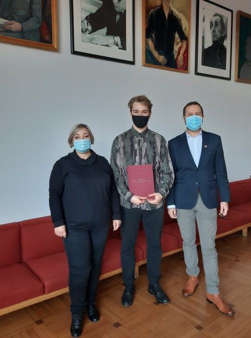 Stypendyści odebrali dyplomy z rąk Rektora Akademii Sztuk Pięknych im. Eugeniusza Gepperta we Wrocławiu, prof. Wojciecha Pukocza oraz Prorektor ds. dydaktycznych i studenckich, dr hab. Beaty Mak – Soboty podczas uroczystego spotkania w Sali Senatu ASP 4 grudnia 2020 roku.