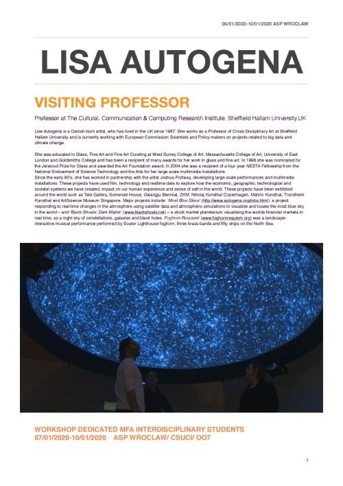 Od 6 do 10 stycznia 2020 r. na Akademii gościć będziemy urodzoną w Danii, a mieszkającą w Wielkiej Brytanii artystkę Lise Frandsen Autogena – profesor w The Cultural, Communication & Computing Research Institute, Sheffield Hallam University, UK.