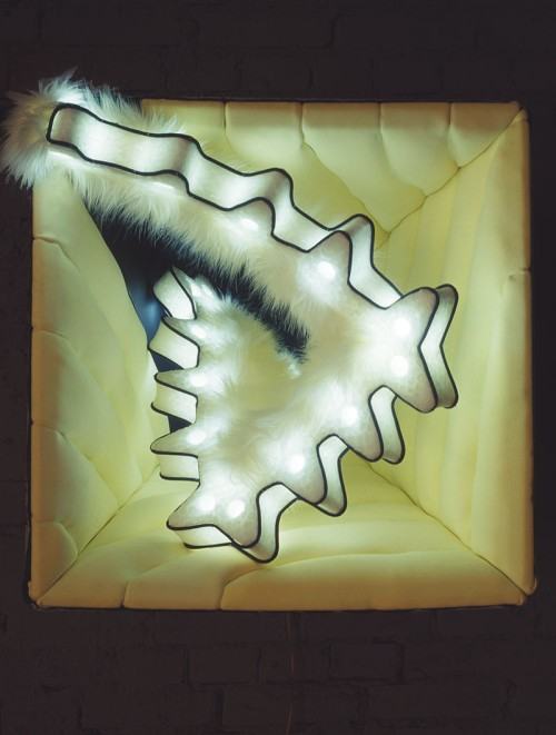 Podobnie, choć nieco inaczej rzecz się ma w przypadku form przestrzennych realizowanych przez młodą artystkę. Formy te – jej zdaniem – to coś w rodzaju okien umożliwiających wgląd w nieznaną rzeczywistość. Konstruowane są one – niczym rzeźby – poprzez budowanie układów płaszczyzn, w które wkomponowane zostają różnego rodzaju elementy. Część z nich autorka „nasącza" barwami. Ale na tym, nie koniec. Martwe układy płaszczyzn i elementów Luiza Zimerman ożywia diodowym światłem.