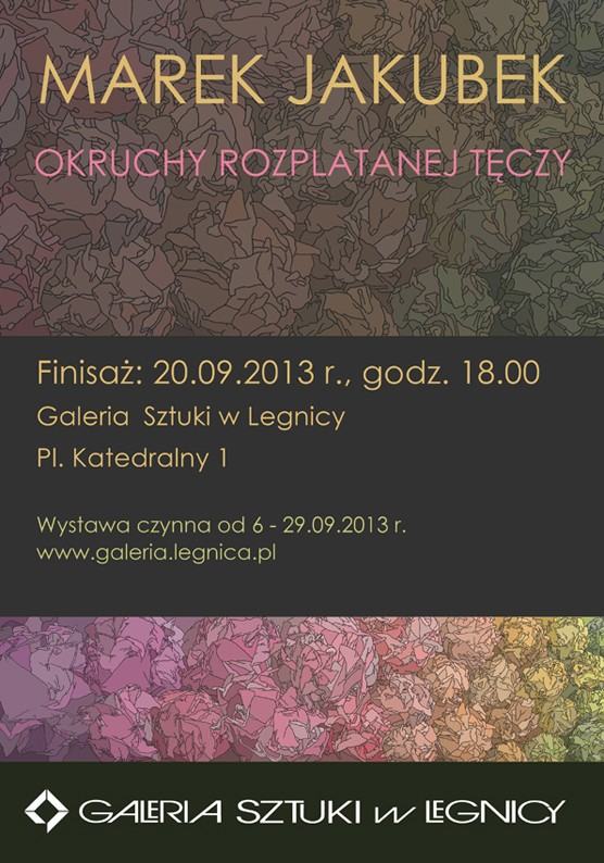 W piątek 20.09. 2013 r. w legnickiej Galerii Sztuki odbył się finisaż wystawy malarstwa profesora Marka Jakubka noszącej tytuł „Okruchy rozplatanej tęczy". Na wystawie, autor zaprezentował 23 obrazy wielkoformatowe powstałe w latach 2012-2013. Obrazy można oglądać w Galerii do 29.09. 2013 r. Tytuł ekspozycji zaczerpnięty został z książki Richarda Dawkinsa "Rozplatanie tęczy", będącej polemiką z poglądami romantycznego poety J. Keatsa, który z żalem zarzucał I. Newtonowi, że ten wyjaśniając zjawisko tęczy, pozbawił ją poetyckiej aury, i zniszczył tym samym jej tajemnicze piękno.