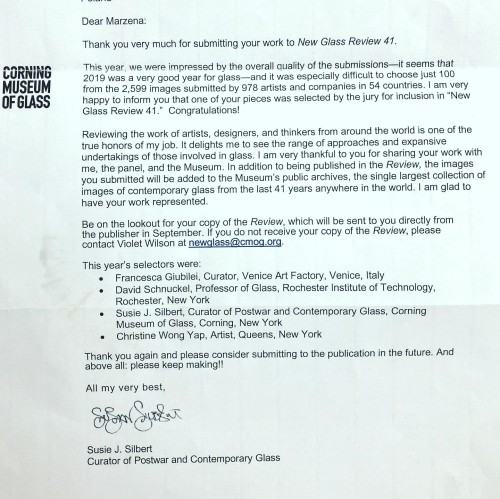 Prace Marzeny Krzemińskiej Baluch zakwalifikowały się do przeglądu "New Glass Review 41" - 100 wybranych szklanych dzieł 2019 roku - wydawanego przez Corning Museum of Glass w Corning w Stanie Nowy Jork.