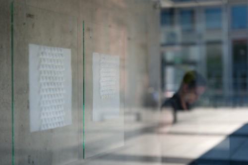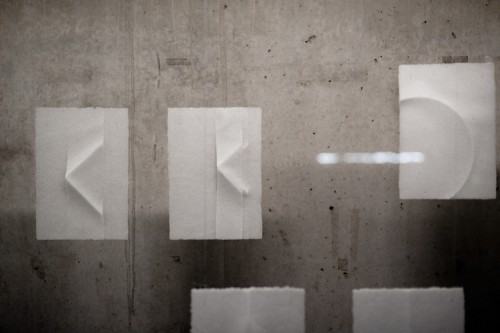 „Pisane cieniem to kompozycja wieloelementowa wykonana ze szkła w technice pâte de verre. Stanowi rezultat przemyśleń i obserwacji powstałych podczas górskich wędrówek zimą. Wymiar pojedynczego elementu ma nasuwać skojarzenie z kartką papieru – formatem tradycyjnego listu, formy przekazu od której odchodzi się na skutek zmian technologicznych, braku czasu i szybkiego tempa życia. Kolor oraz struktura pracy jest nawiązaniem do ulotnej materii jaką jest śnieg kształtowany przez silny wiatr na zboczu gór."