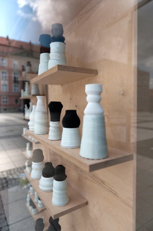 Szlachetna, nobilitująca i luksusowa, toczona na kole garncarskim porcelanowa podstawa, szkliwiona rzadkim seladonowym (biel z odcieniem turkusu) szkliwem odsyła nas do wielowiekowej chińskiej tradycji. Precyzyjnie utkana, o kolorach nie występujących w naturze część wieńcząca formę nie zdradza historii swojego powstania - wyjętego ze śmietnika, przetworzonego do postaci filamentu plastiku, który posłużył do jej wydrukowania.
