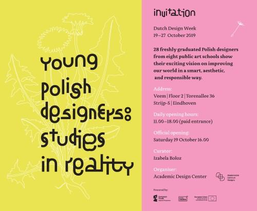 Wystawa Young Polish Designers: Studies in Reality, organizowana przez Akademickie Centrum Designu, prezentuje projekty, które budzą nadzieję na przyszłość. Prace dwudziestu ośmiu świeżo upieczonych projektantów z ośmiu uznanych publicznych szkół artystycznych obejmują przedmioty codziennego użytku, projekty rozwiązujące problemy współczesnego świata oraz tworzące lepszą przyszłość dla kolejnych pokoleń. Projektanci proponują odpowiedzialne i estetyczne rozwiązania z wykorzystaniem różnorodnych metod i narzędzi. Prace wyselekcjonowane na wystawę obejmują wiele obszarów projektowania – od projektu koncepcyjnego, obiektów i usług po projektowanie społeczne i komunikację wizualną.