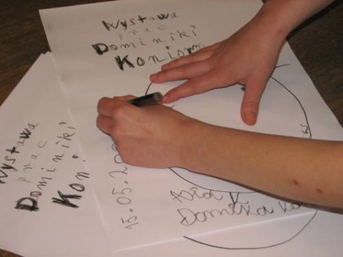 Dominika uczy się w Zespole Szkół Specjalnych Stowarzyszenia Handicap we Wrocławiu. Artystka jest laureatką II nagrody w konkursie "Kocham ,lubię ,maluję Wrocław- Nasze Miasto" 2008 W szkole zajęcia z ceramiki z Dominiką prowadzi Anna Kutera , technik tkackich uczy ją Anna Dubińska a w Akademii nad rozwojem talentu malarskiego i rysunkiem czuwa prof.Wojciech Lupa. Mogłbym w tym miejscu długo wymieniać ludzi ,którzy pracują z Dominiką i jej koleżankami i kolegami.Ale i tak wiadomo ,że najważniejsza jest Mama :) Dobrym duchem całego przedsięwzięcia był prof Wojciech Lupa któremu dzielnie asystował Łukasz Huculak. Tekst i zdjęcia : Piotr Osowicz