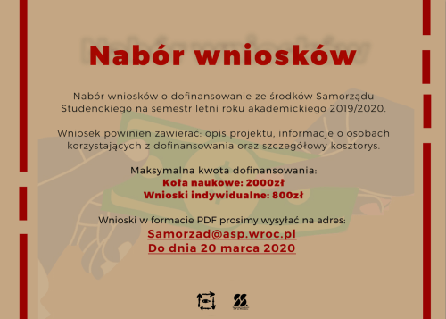 Wraz z rozpoczęciem nowego semestru Samorząd Studencki ogłasza nabór wniosków o dofinansowanie kół naukowych lub projektów indywidualnych z budżetu Samorządu Studenckiego. Wniosek powinien zawierać opis projektu, informacje o osobach korzystających z dofinansowania oraz szczegółowy kosztorys.