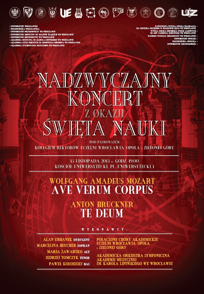 Nadzwyczajny Koncert z okazji Święta Nauki Wrocławskiej, odbędzie się 15 listopada br. o godz. 19:00 w Kościele Uniwersyteckim we Wrocławiu.