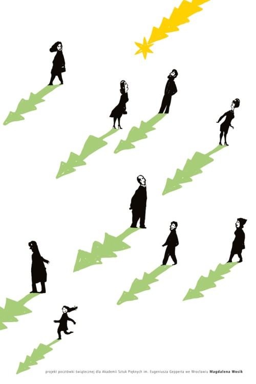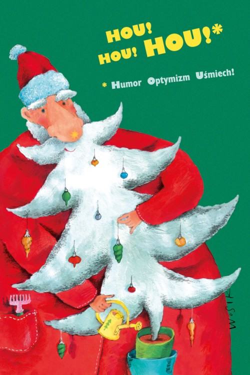 To w większości kartki zaprojektowane dla wrocławskiej Akademii Sztuk Pięknych – na ulicy, w ogromnym powiększeniu, stają się plakatami anonsującymi zbliżający się świąteczny czas. Przypomina o tym tytułowa choinka, obecna niemal na każdej pracy, ale zawsze w inny sposób – raz dostrzegamy ją w kształcie łaty na ubraniu biedaka, innym razem jest fantazyjnie zaczesaną brodą Świętego Mikołaja, gdzie indziej upodabnia się do artystycznych atrybutów: pędzla, stalówki i ołówka, to znów powiewa jak husarskie skrzydło kawalerzysty, przypominającego o polskiej tradycji.
