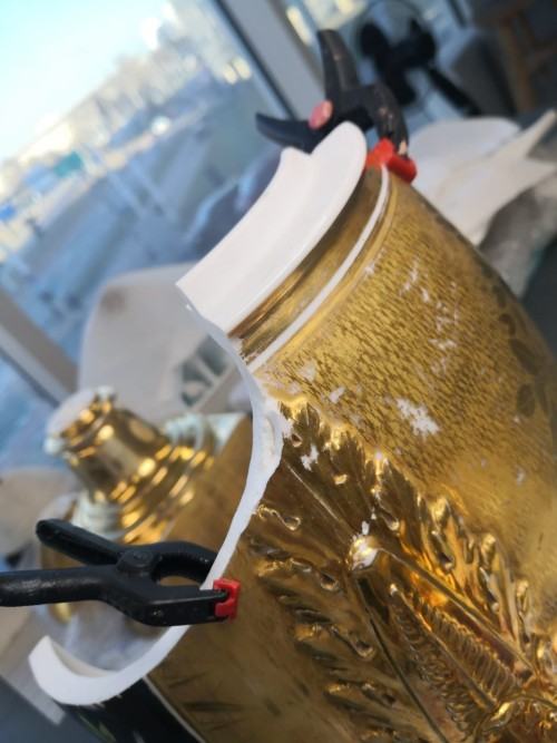 W ramach dyplomu wykonano także kopię brakującego uchwytu z porcelany plastycznej. Kopia została poszkliwiona i pozłocona, a następnie zamontowana do oryginalnego obiektu.