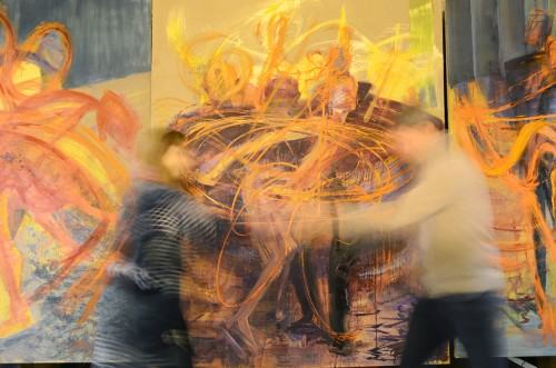 W której autorka zbudowała kompozycję z prac wykonanych w zróżnicowanych tynkach, także na przezroczystym pleksi, bazując na wcześniejszych swoich obrazach przedstawiających narciarzy freestylowych podczas skoków czy tańczące kobiety.