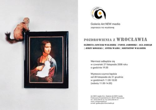 Serdecznie zapraszamy na otwarcie wystawy Pozdrowianie z Wrocławia. Wernisaż odbędzie się w czwartek 27 listopada o 19.00 w galerii Art NEW media przy Krakowskim Przedmieściu 41. Na wystawie prezentujemy sześć artystycznych indywidualności pod wspólnym hasłem "Pozdrowienia z Wrocławia". Do pokazu wybraliśmy prace najbardziej charakteryzujące twórczość każdego z nich. Są to artyści należący do dwu różnych pokoleń, używający różnych mediów i środków wyrazów. Łączy ich to, że wszyscy związani są z Wrocławiem i reprezentują to, co w sztuce tego środowiska najciekawsze. Zaprasza Jerzy Kosałka www.artnewmedia.pl
