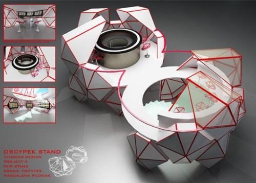 Radosna multiplikacja powywracanych graniastosłupów, to koncepcja Magdaleny Poźniak studentki piątego roku II pracowni projektowania architektury wnętrz prof. Dariusza Grzybowicza...