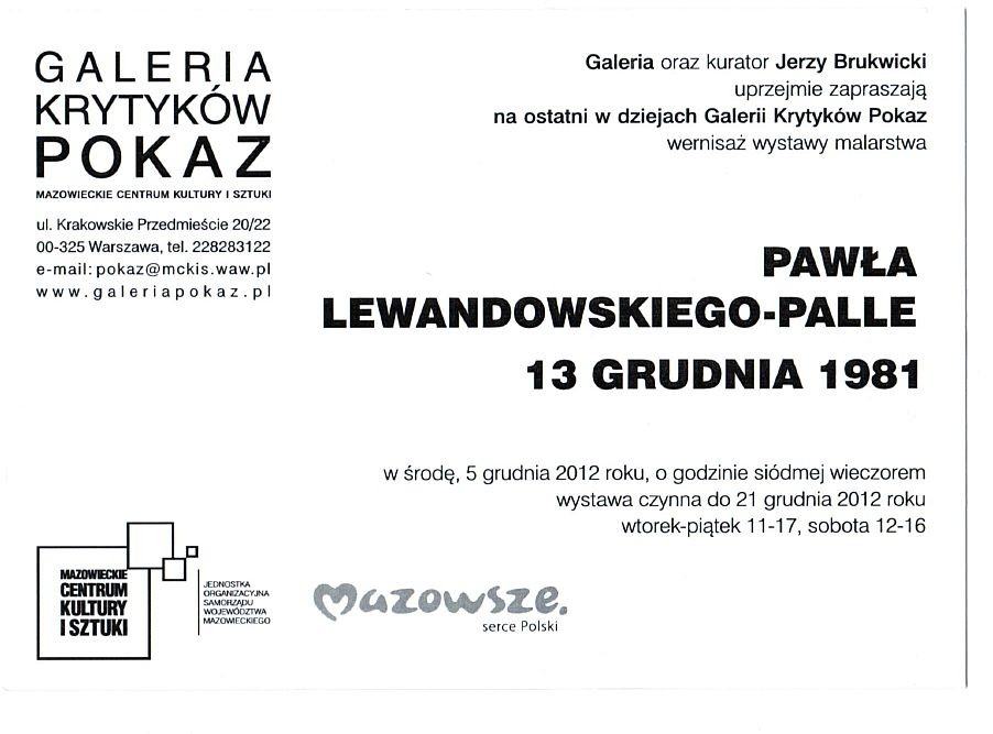 21 grudnia 2012 roku przestaje istnieć Galeria Krytyków POKAZ w Warszawie. Zaszczyt ostatniej wystawy w tej prestiżowej galerii przypadł profesorowi Lewandowskiemu-Palle. Kurator galerii, Jerzy Brukwicki wybrał na tę okoliczność kilkanaście obrazów malarskich z cyklu 13 grudnia 1981, taki też tytuł nosi warszawska wystawa.