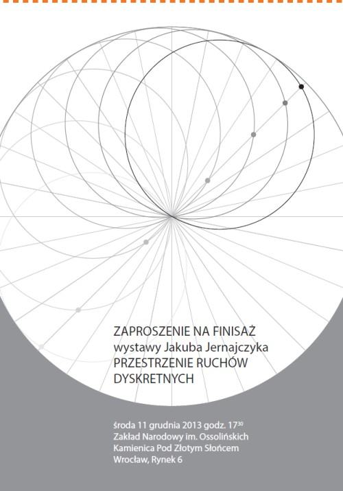 Zakład Narodowy im. Ossolińskich zaprasza na finisaż wystawy Jakuba Jernajczyka PRZESTRZENIE RUCHÓW DYSKRETNYCH, który odbędzie się 11 grudnia 2013 r. o godz 17.30, w Kamienicy Pod Złotym Słońcem (Wrocław, Rynek 6).