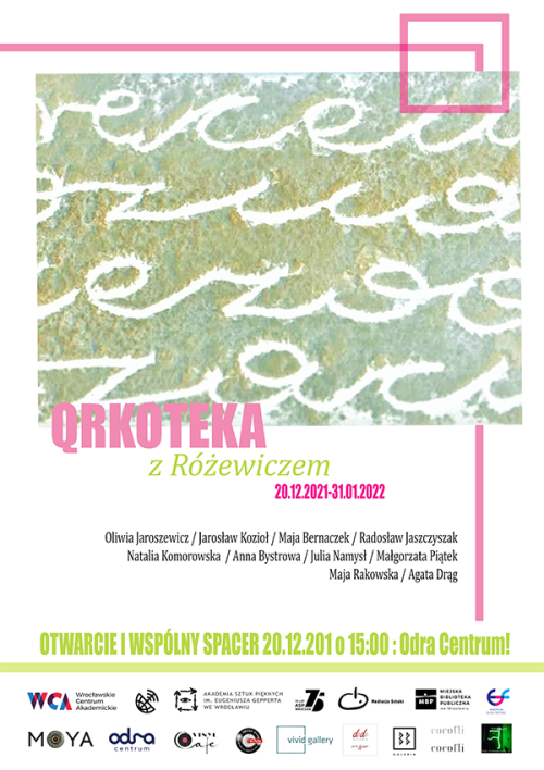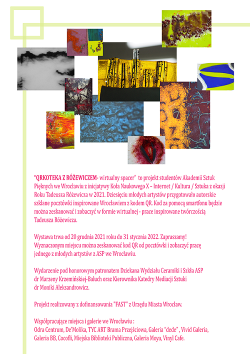 Dziesięciu młodych artystów przygotowało autorskie szklane pocztówki inspirowane Wrocławiem z kodem QR. Kod za pomocą smartfona będzie można zeskanować i zobaczyć w formie wirtualnej- prace inspirowane twórczością Tadeusza Różewicza. Wyznaczonym miejscu można zeskanować kod od pocztówki i zobaczyć pracę jednego z młodych artystów z ASP we Wrocławiu.