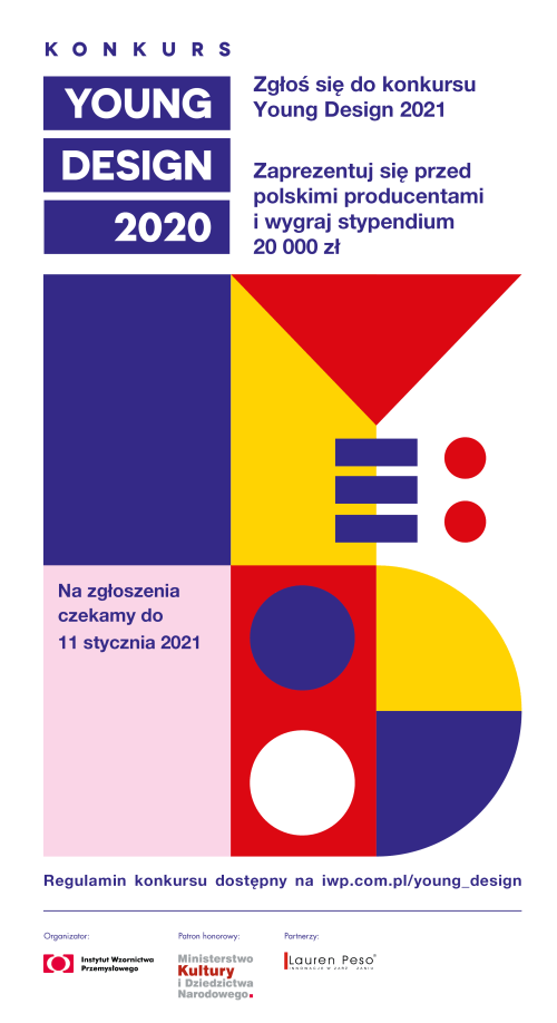 Organizowany przez Instytut Wzornictwa Przemysłowego po raz 13. konkurs skierowany jest do studentów i absolwentów wzornictwa. Wystarczy do 11 stycznia 2021 r. przysłać trzy najlepsze projekty ze swojego portfolio (szczegóły w Regulaminie Konkursu).