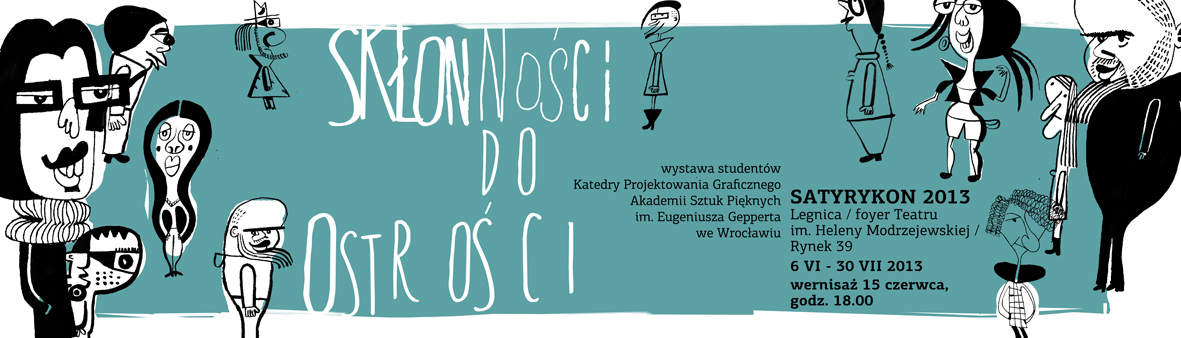 Kto uwodzi fryzurą, a kto zwleka się z łóżka po 19.00, kto całuje namiętnie i dlaczego Temuulen zasypia na zajęciach? O czym się rozmawia w bramie na Żeromskiego i na czym polega depressive design? Tego wszystkiego dowiecie się z wystawy studentów Katedry Projektowania Graficznego wrocławskiej ASP pt.„Skłonności do Ostrości". To coroczny pokaz, na którym prezentują się kolejne polskie uczelnie plastyczne, zainaugurowany w 2011 r. przez Pracownię Ilustracji warszawskiej ASP prof. Zygmunta Januszewskiego. Podczas Międzynarodowej Wystawy Satyrykon pokazują prace swoich studentów, młodych grafików, komentujących rzeczywistość w sposób przewrotny, krytyczny, drapieżny. Na tegoroczną wystawę składają się realizacje, w większości powstałe podczas warsztatów ilustratorskich prowadzonych przez Tomasza Brodę i Magdę Wosik. Motywem przewodnim tegorocznej edycji „Skłonności do Ostrości" jest twórczość autotematycza – studenci opowiadają tu o sobie, a wystawa i towarzyszący jej katalog układają się w opowieść o nich samych i o studiowaniu, o ich rodzinnych miejscowościach i o tym, jak postrzegają Wrocław.