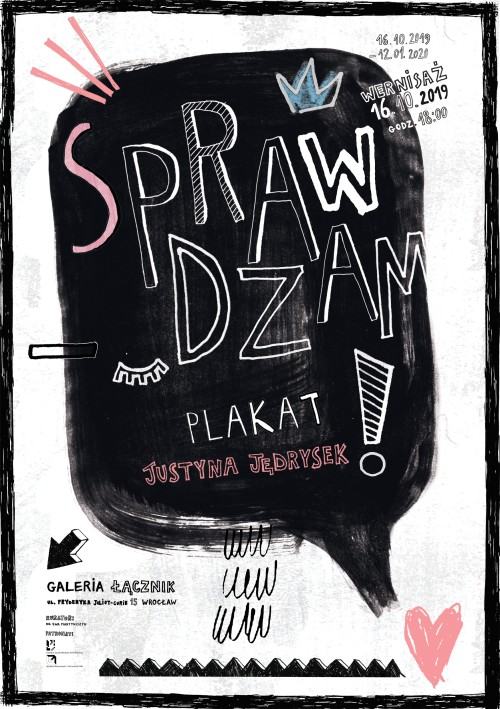 Tytuł wystawy plakatów Justyny Jędrysek „Sprawdzam plakat" wpisuje się w ideę galerii i połączeń. Za pomocą sztuki plakatu, zajmującego od kilku lat wyjątkowe miejsce w twórczości Autorki, Justyna Jędrysek komentuje rzeczywistość, podejmuje aktualne tematy społeczne(czasem trudne i niewygodne), wchodzi w interakcję z odbiorcą wydarzeń kulturalnych.