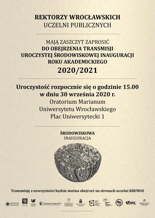 Rektorzy Wrocławskich Uczelni Publicznych mają zaszczyt zaprosić do obejrzenia transmisji Uroczystej Środowiskowej Inauguracji Roku Akademickiego 2020/2021, która rozpocznie się 30 września 2020 r., o godz. 15.00. Transmisję będzie można obejrzeć na stronach uczelni KRUWiO.