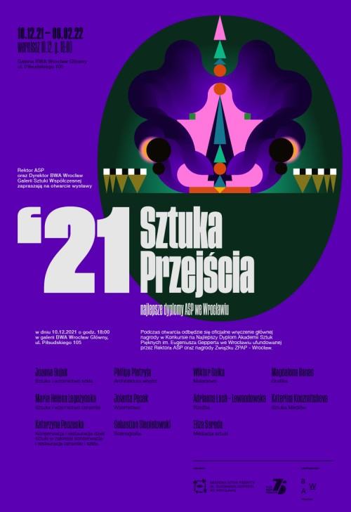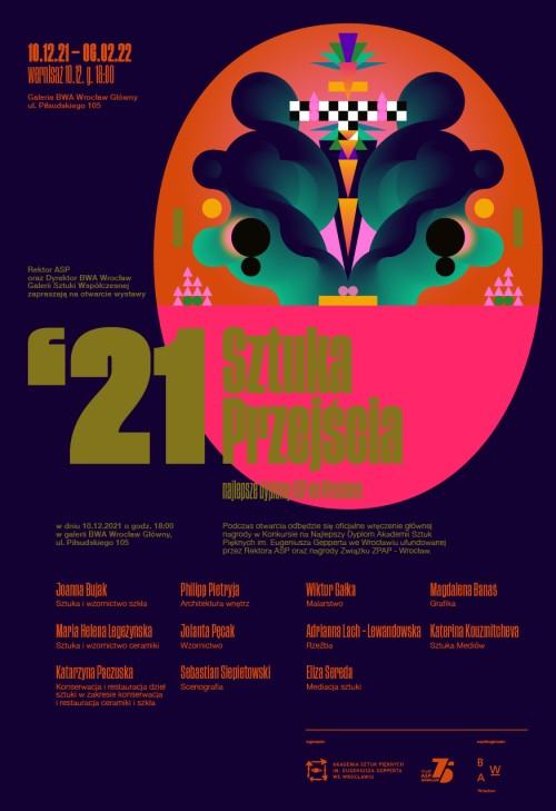 Podczas wernisażu, który odbędzie się w piątek 10 grudnia, ogłoszone zostaną wyniki konkursu oraz laureat głównej nagrody dla najlepszego dyplomu w roku 2021, ufundowanej przez Rektora Akademii i laureat nagrody Związku ZPAP – Wrocław.