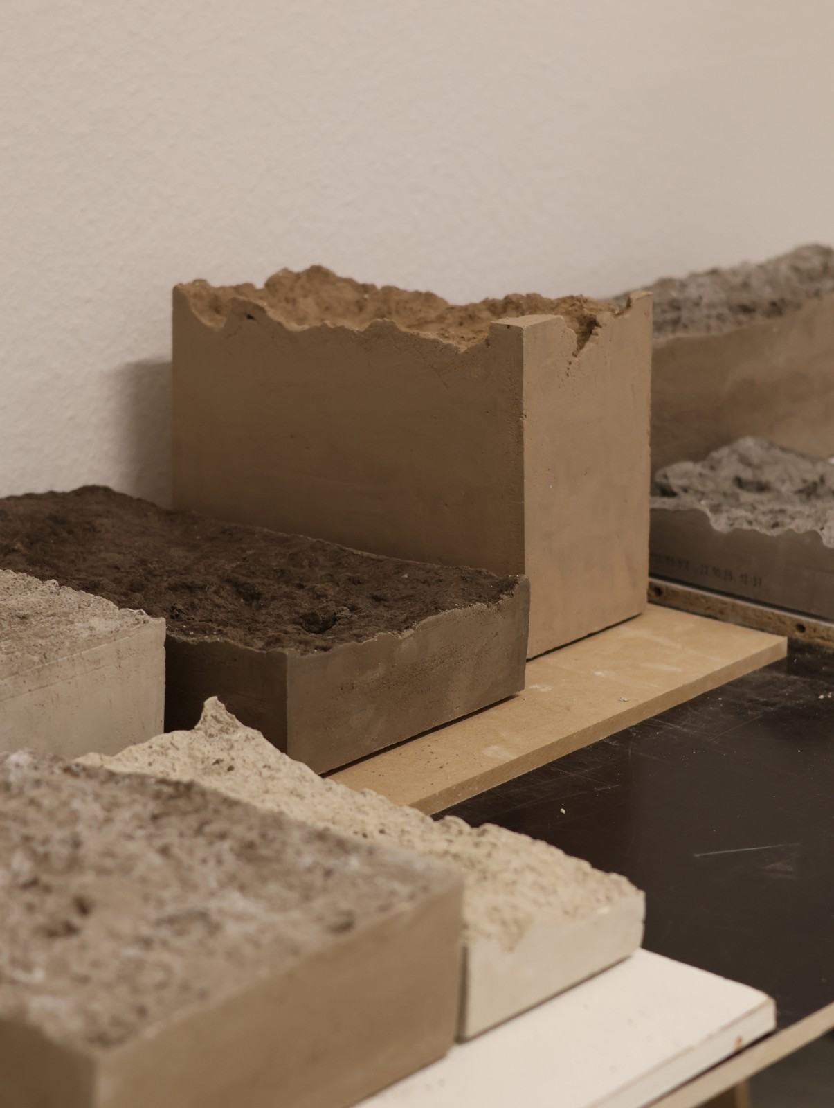 Punktem wyjścia projektu była ziemia traktowana jako nośnik pamięci. Artystka zebrała próbki gruntu z siedemnastu lokalizacji związanych z dawnymi zakładami włókienniczymi. Na ich podstawie powstała seria obiektów ceramicznych - odcisków w glinie, pokrytych zmieloną ziemią z konkretnych miejsc. Ostateczny kolor i struktura wynikają z naturalnych właściwości gleby, ujawniając się dopiero w procesie wypału w wysokiej temperaturze.