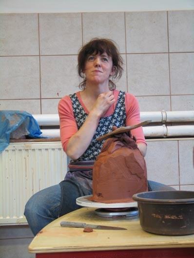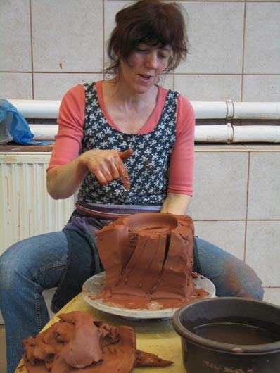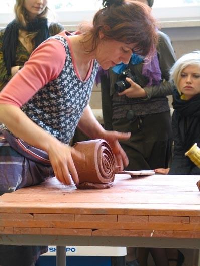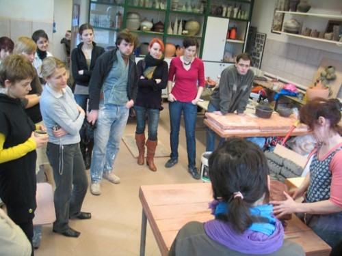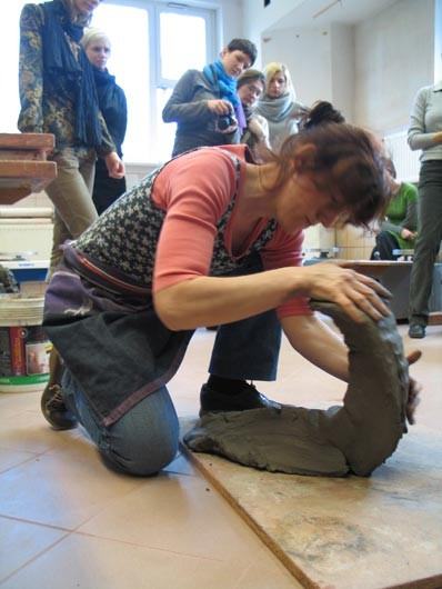 Przemyślenia Ali Patanowskiej Przy cienkościennej ceramice lepionej z wałeczków, do której mój szacunek jest nie kwestionowalny spotkanie - zderzenie, z tak odmiennym traktowaniem gliny jest oddechem, potrzebnym zwłaszcza poszukującemu studentowi. (prace Anne dla przykładu przy wielkości ok 50x50x50 ważą i 60 kg ) Uważam że warsztaty z różnymi artystami w czasie studiów są niezmiernie cenne, bo pozwalają konfrontować zdobytą na Uczelni wiedzę z innymi sposobami pracy w absolutnie przystępny sposób, mając artystów na miejscu. Warsztaty z Anne trwają cały tydzień, każdego dnia pracujemy na bazie działań, doświadczeń, zdobytych dnia poprzedniego. Wszystko odbywa się w bardzo prosty sposób. Artystka opowiada o własnych sposobach pracy z gliną - co ważne na przykładach. Pytam jak coś zrobiła, a ona opowiada krok po kroku o szczegółach technik i o tym w jaki sposób do tego doszła, co wtedy myślała, czyli nie tylko o tym jak tworzy swoją ceramikę w sensie fizycznym, ale i o tym jak wygląda jej dzień w pracowni, że zamiata, grabi liście, siedzi, patrzy na wodę... szuka skupienia. Pracuje bardzo ekspresyjnie. Glinę rwie, tnie, uderza o podłogę, o kolano... najpierw mechanicznie, szybko potem patrzy patrzy patrzy dodaje, odejmuje, szuka swojej harmonii. Nakłada angoby, poleruje, odymia... Mówi niedużo, dużo robi. Zapamiętałam szczególnie jak powiedziała że czasem woli po prostu pożucić coś co robi już jakiś czas, aby spróbować nowego, niebezpiecznym jest dla niej kontynuowanie wciąż tej samej drogi, woli ( co widać w zaprezentowanych przez nią pracach ) eksperyment. Z powodu dużego zainteresowania studentów odbył sie specjalny pokaz podczas którego artystka zaprezentowała większemu gronu swoje metody pracy. Anne Bulliot prowadzi warsztaty i wykłady w Europejskim Instytucie Sztuk Ceramiki w Guebwiller w Alzacji. Wizyta Anne Bulliot odbywa się w ramach współpracy kulturalnej pomiędzy Alzacją a Dolnym Śląskiem i jest częścią projektu związanego z międzynarodową wymianą wykładowców katedry ceramiki ASP we Wrocławiu oraz IEAC. W czasie gdy Anne prowadzi warsztaty z nami w Alzacji przebywa Pani Prof. Lidia Kupczyńska-Jankowiak prezentując Swój dorobek twórczy, jak i ceramikę użytkową powstającą na wrocławskiej Akademii Sztuk Pięknych. Przemyślenia i tekst : Ala Patanowska